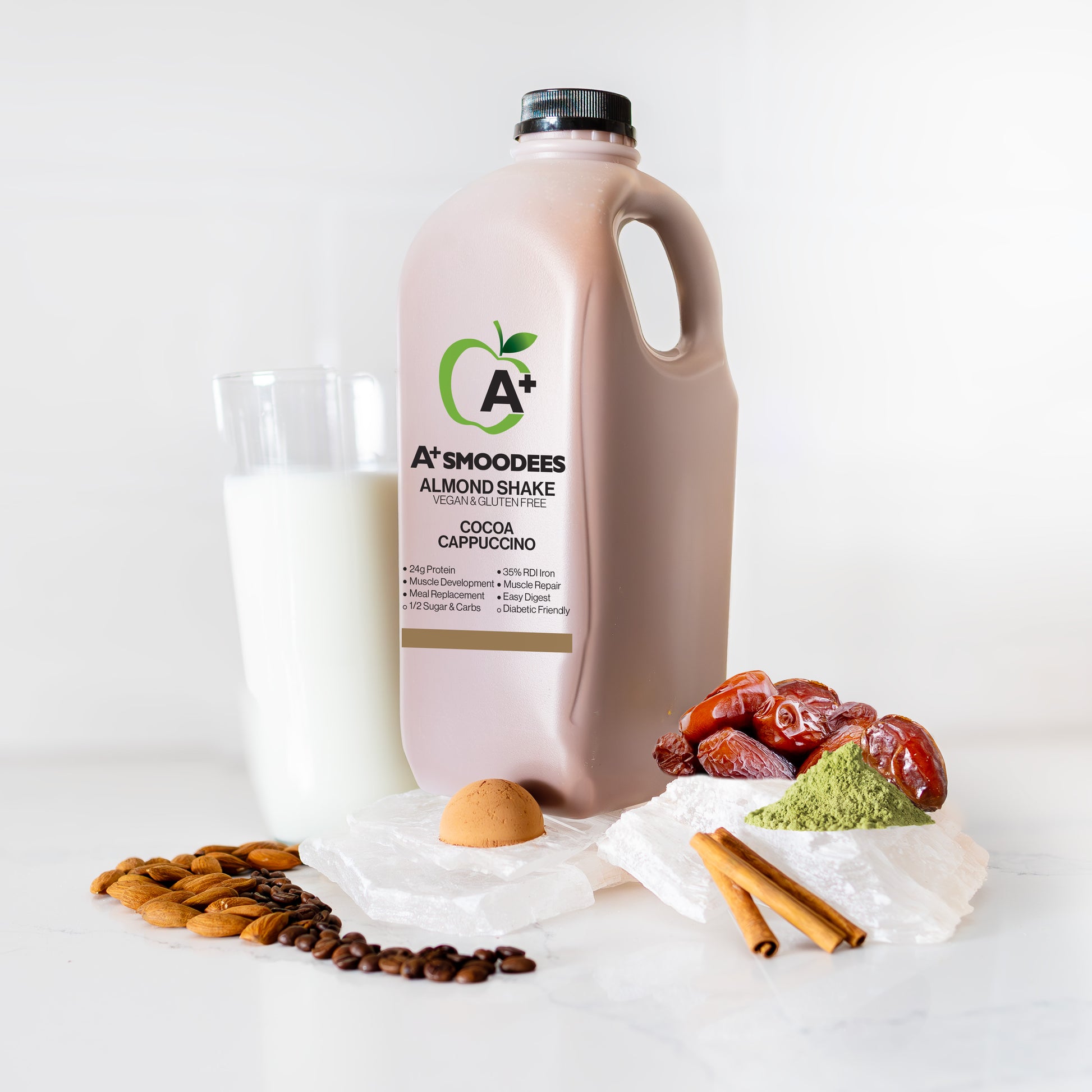 Unsweetened almond milk, espresso, dates, A+ Pumpkin Seed Powder, cinnamon, 100% cocoa powder.
